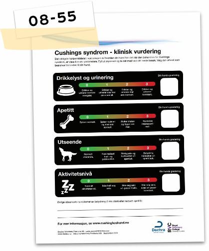 Siden det er av avgjørende betydning å overvåke de kliniske tegnene (symptomene) på Cushings, er Cushings clinical score utviklet slik at det er enkelt å registrere og holde oversikt over de viktigste symptomene. Vi anbefaler at du fullfører scoren før hvert besøk hos veterinæren, og at du deler resultatet med veterinæren.